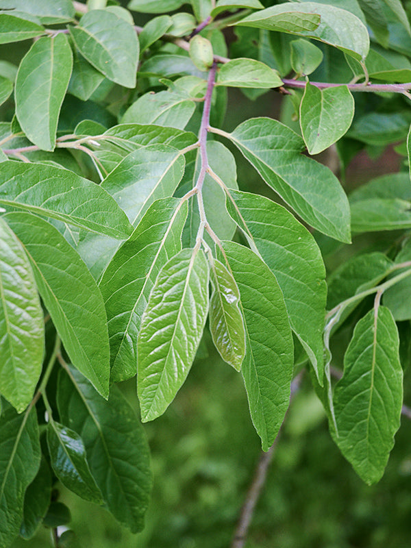 Leaves are simple, alternate, 2 to 6 inches long, and 1 to 3 inches wide. They are ovate to elliptical and are shiny green. The bark is brown to dark grey and is very deeply furrowed giving it a distinct blocky appearance. The fruit matures in September to October and is orange in color and soft when ripe. They are about 1 to 2 inches long and round.