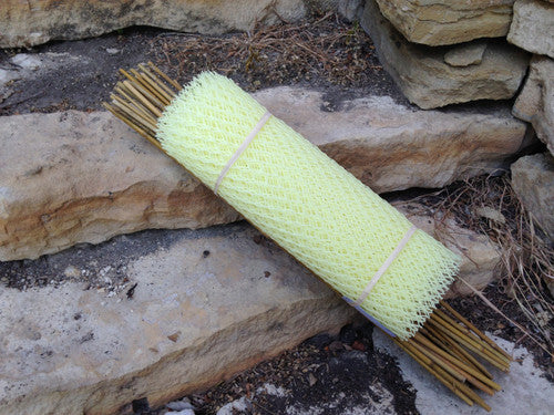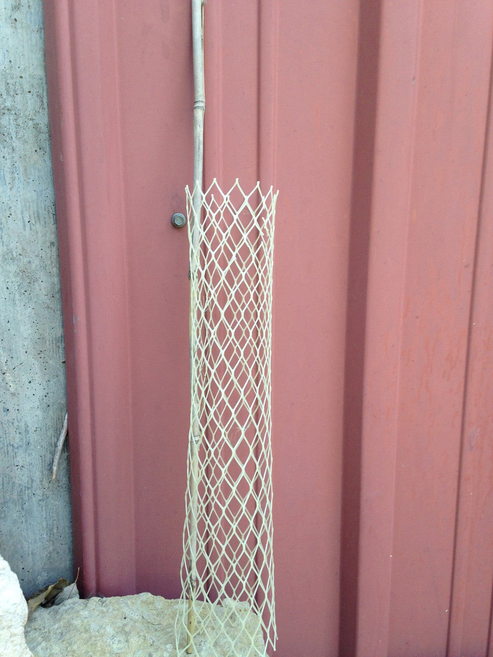 The bamboo stakes are strong, thick-walled, rot-resistant and will last as long as the tubes. Weave a stake through the diamond mesh openings of the rabbit protective tube. The stake should begin on the outside of the tube and finish with the stake on the inside. Animals have been known to destroy newly planted seedlings the first night after they were planted. Although tubes can be placed over the seedlings later, tubes should be installed the same day the seedlings are planted.