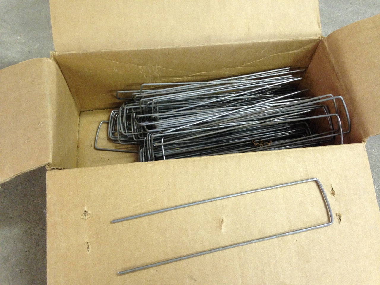 Pull the seedling through the center opening. Place pins in the four corners and two in center of the fabric. The 8-inch pins tend to work out of the soil until they are pitted from soil moisture. They may have to be shoved back into the soil occasionally for a couple of weeks, then they will hold well on loam or clay soils. On lighter soils, a shovel of soil may have to be placed on the corners to secure the fabric. If weeds grow through the seedling hole, pull them out before they become well established.